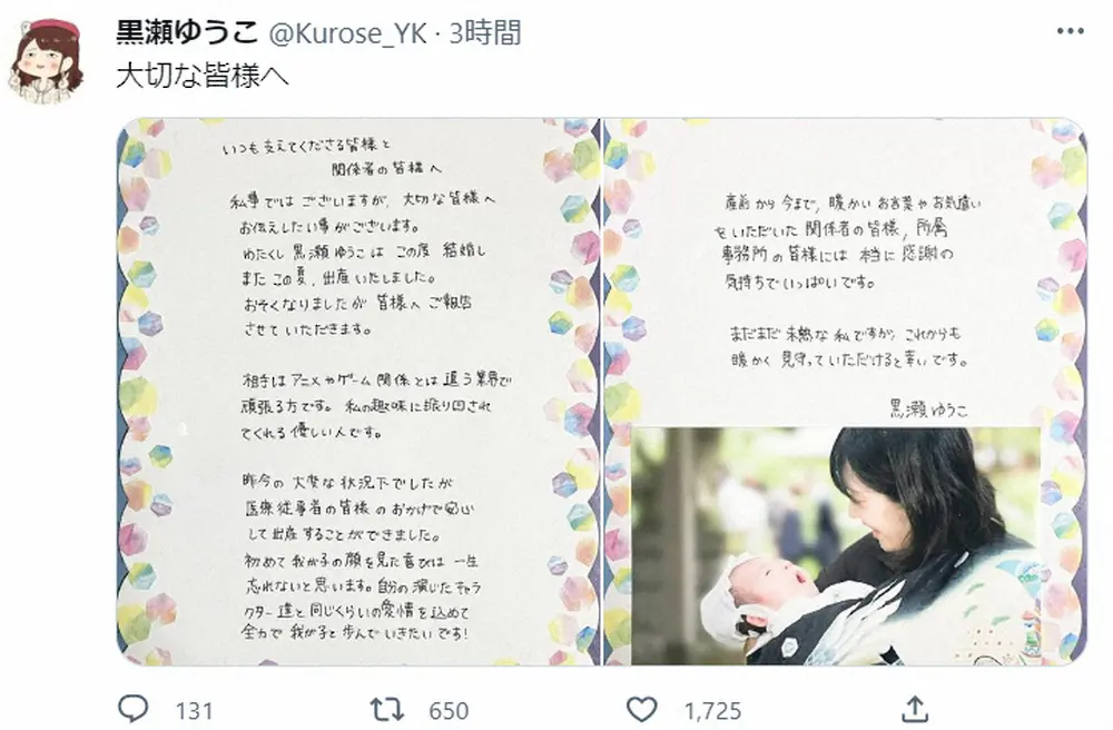 黒瀬は、直筆で「私事ではございますが、大切な皆様へお伝えしたい事がございます。わたくし黒瀬ゆうこはこの度結婚しまたこの夏、出産いたしました。おそくなりましたが、皆様へご報告させていただきます」と発表。「相手はアニメやゲーム関係とは違う業界で頑張る方です。私の趣味に振り回されてくれる優しい人です」とコメントした。