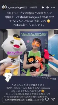 さらに、あ~ちゃんは一番乗りでストーリーズを更新し「今日ライブでお客様とみなさんに相談をして本当にInstagramを始めさせてもらうことになりました perfumeあ~ちゃんです」と投稿。現在開催中のツアー「PLASMA」福岡公演での写真をアップし「これはここ最近のベストショットです in福岡」とつづった。続けて「くだらんことばっか書きすぎて気づいたらな~んにもおもろくないInstagramになっとるかもしれませんが 私らしく発信したなにかが誰かと繋がってなにかになったらこの上ない幸せです。どうぞよろしくお願いします」とコメントした。