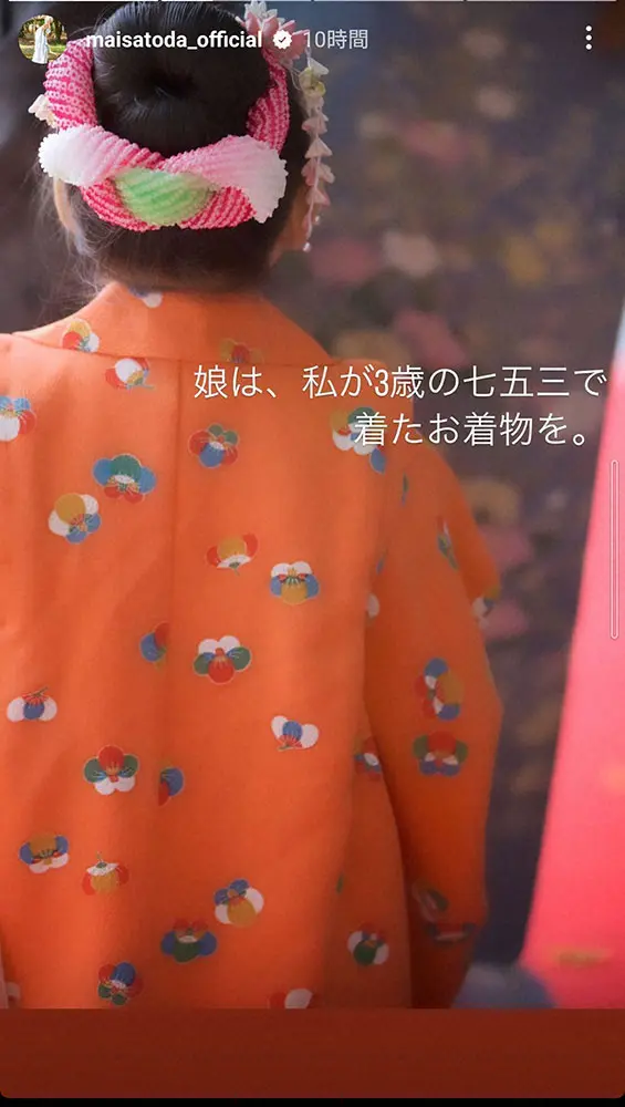 また、長女の着物は「私が3歳の七五三で着たお着物を」と説明し、オレンジ糸の地の着物を着た姿を披露。また、「時代」として、里田自身が3歳の時に同じ着物を着ている写真も披露した。