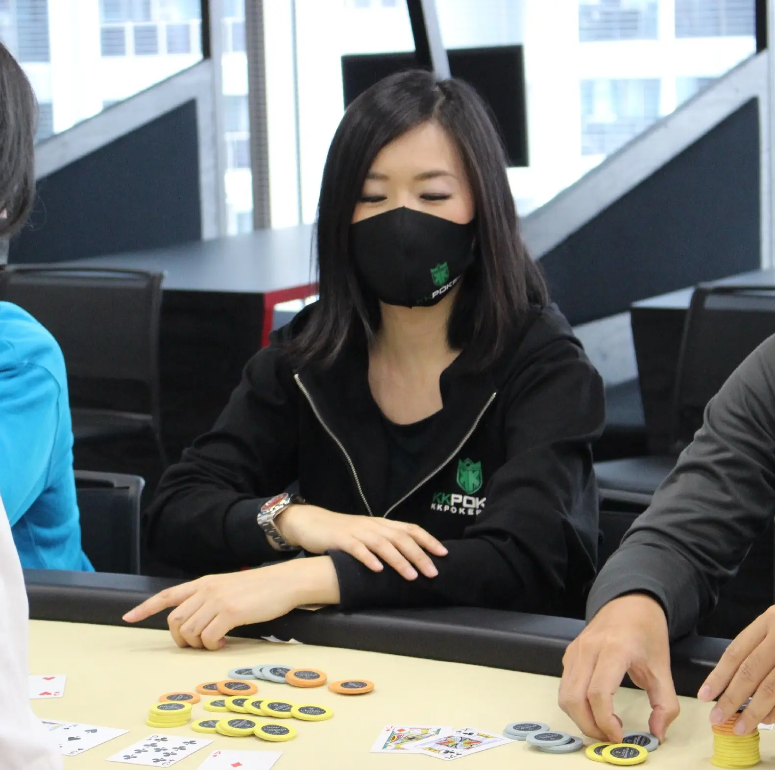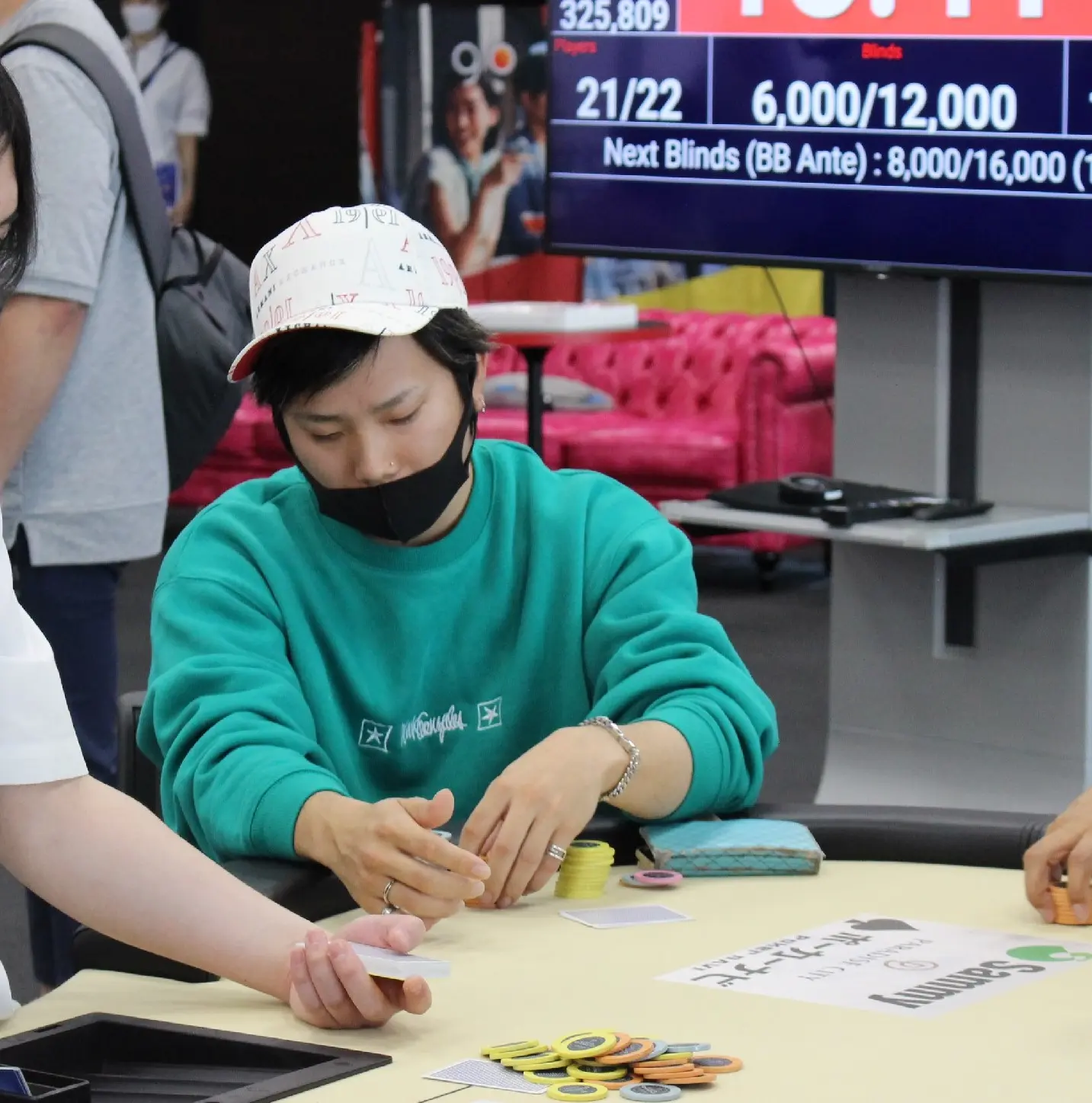 このトーナメントは全国のポーカースポットで予選を開催し、DAY1、DAY2を勝ち抜いた22人がエントリーした。森本さんは無理な勝負には出なかった。「うまい方ばっかりだったので、こっちが強いハンドでベットしても、レイズに対してリスペクトを持って降りられたことで減らさずに済んだ」。5人に絞られた時点でチップは46万5000で最下位になったが、ここから踏ん張った。