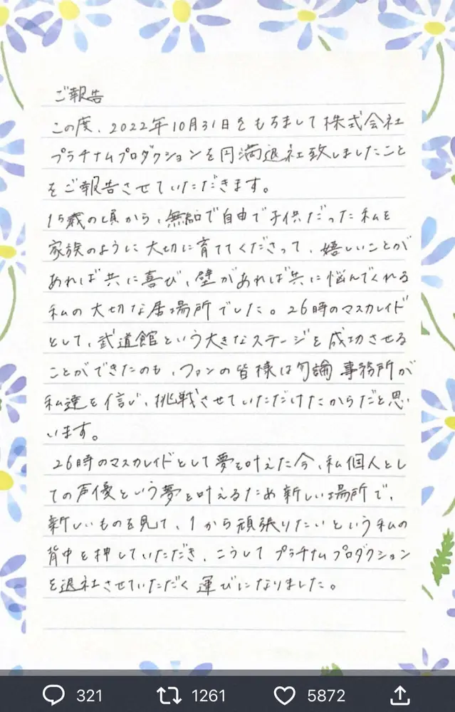 来栖りん公式インスタグラム(@ringring_rin)から 元ニジマス・来栖りん 所属事務所を円満退社 直筆で発表「声優という夢… ギャラリーで見る この記事のフォト 2022年11月01日の画像一覧 もっと見る 2022年11月01日の画像をもっと見る