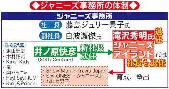 創業当時からジャニー氏が人材発掘と育成、故メリー藤島さんが経営面を手掛けてきたジャニーズ。体制移行後はジャニー氏の後継者を滝沢氏、メリーさんの後継者を藤島ジュリー景子社長が務めてきた。今回アイランドの社長が代わり、井ノ原の経験が少ないうちは、ジュリー社長がアドバイスしながら運営していくことになるとみられる。