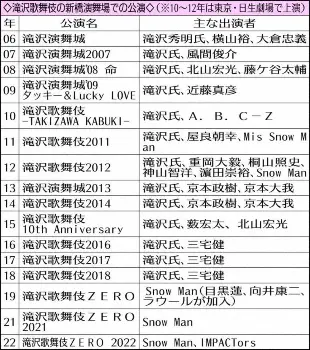 作品は2006年に滝沢氏主演の「滝沢演舞城」として誕生し、10年から名前を変え「滝沢歌舞伎」となった。19年にSnow Manが継承して「滝沢歌舞伎ZERO」となり、滝沢氏が演出を担当。例年東京・新橋演舞場で4~5月に上演され、地方公演が行われる年もあった。
