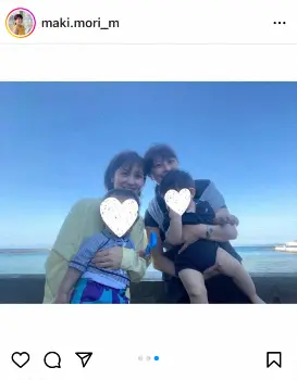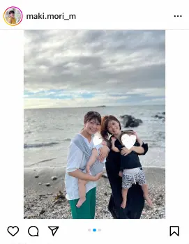 「11月 秋真っ盛りですが夏の思い出」とつづり、鈴江アナ親子との4ショットを掲載。「今年は同期鈴江奈々ちゃん家族と海で一緒に過ごせました」と明かし、「私たちが同級生、そして次男同士も同級生です」とお互いが次男を抱っこする姿で披露した。