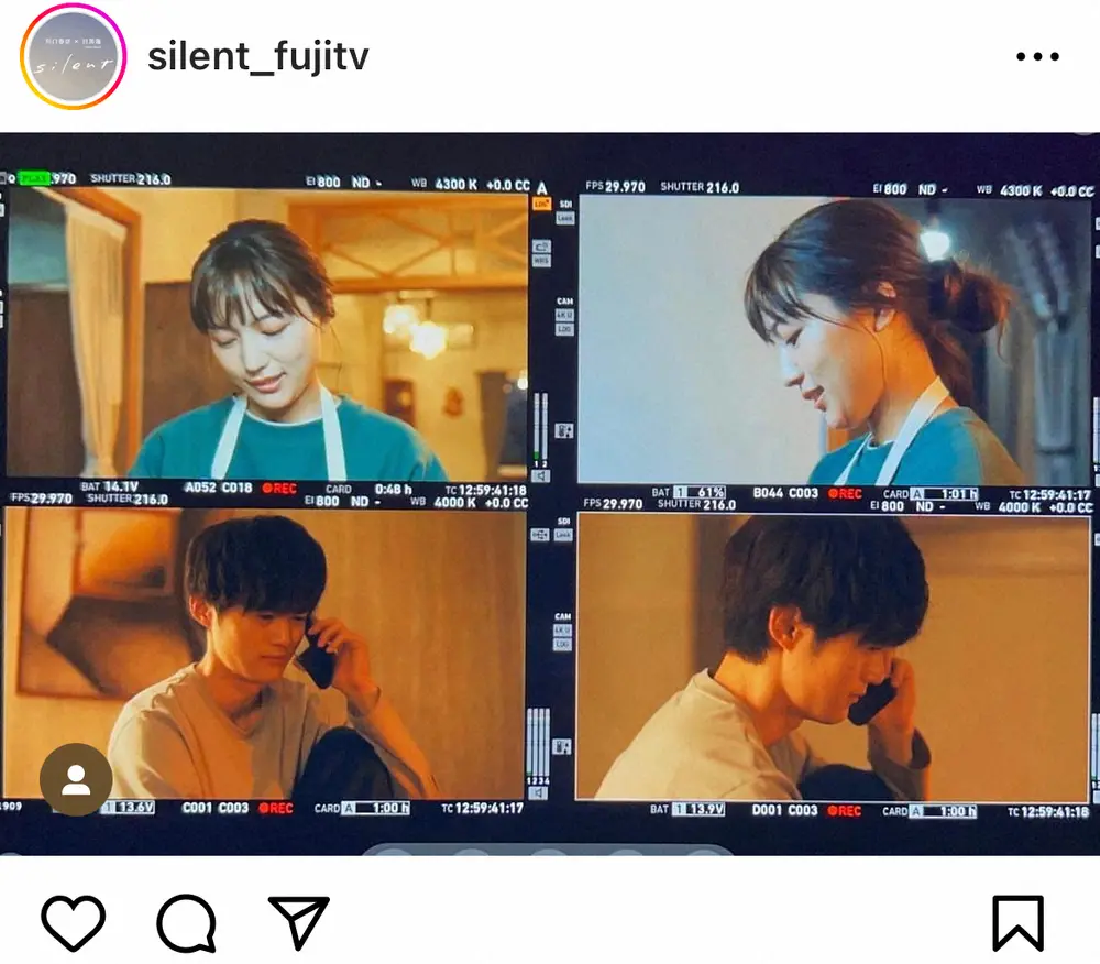 4日に更新された「silent」の公式インスタグラムでは、第5話で川口演じる青羽紬と俳優の鈴鹿央士演じる戸川湊斗が電話をするシーンについて解説され、話題に。「ハンバーグを作っている最中にかかってきた、湊斗からの電話 このシーンは、セットの2箇所に撮影クルーを分け、実際にふたりが通話した状態で撮影されました」と明かされ、「これは、スタッフが確認するモニターを撮影した1枚です」と、2人が電話をしているモニター越しのショットが公開された。