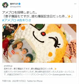 また、ブログでも「息子爆誕もですが…娘も爆誕記念日だった件…」のタイトルで投稿。「出産でバッタバタの10月でしたが…実は娘も誕生日だったんだよね~」と10月27日に3歳の誕生日を迎えた長女の誕生日も報告。「ということで…お誕生日おめでと~!!!」と、吉木と夫・和田正人と長女の写真も飾られた“ドキンちゃん”の誕生日ケーキの写真を添えた。