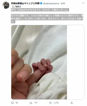 「昨日、2380gの小さな子あすわ(女の子)が誕生しました」と書き出すと、「母子共に健康です。これから新米の親として皆様に支えて頂きながら、素敵な家族にしていきたいと思います」と決意。「ありがとう。君の人生の全てを愛そう」と記した。