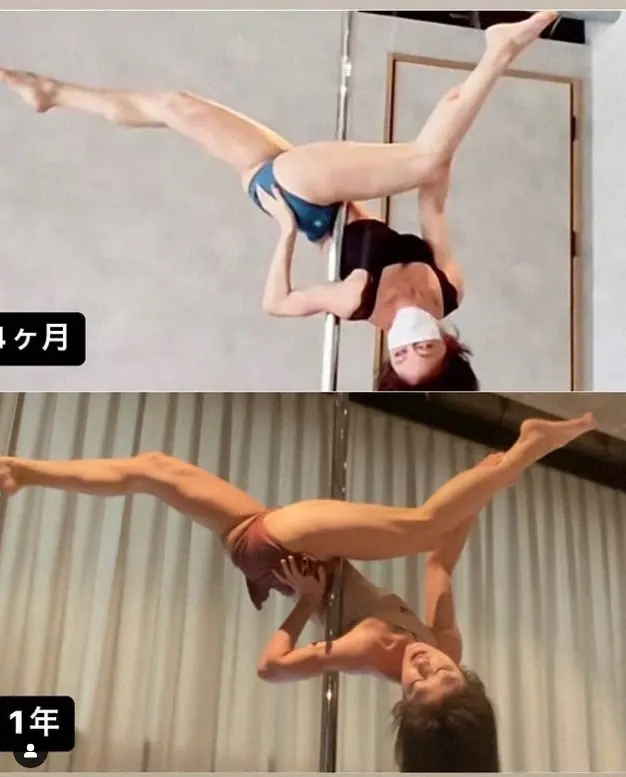 「ポールを始めて1年が経ったよ ジェイドスピリット ちょっとだけど始めた頃より開脚が成長してる 全然まだまだだけど 苦手な柔軟も頑張る」とつづり、4カ月前と1年前の開脚ポーズの比較写真をアップした。