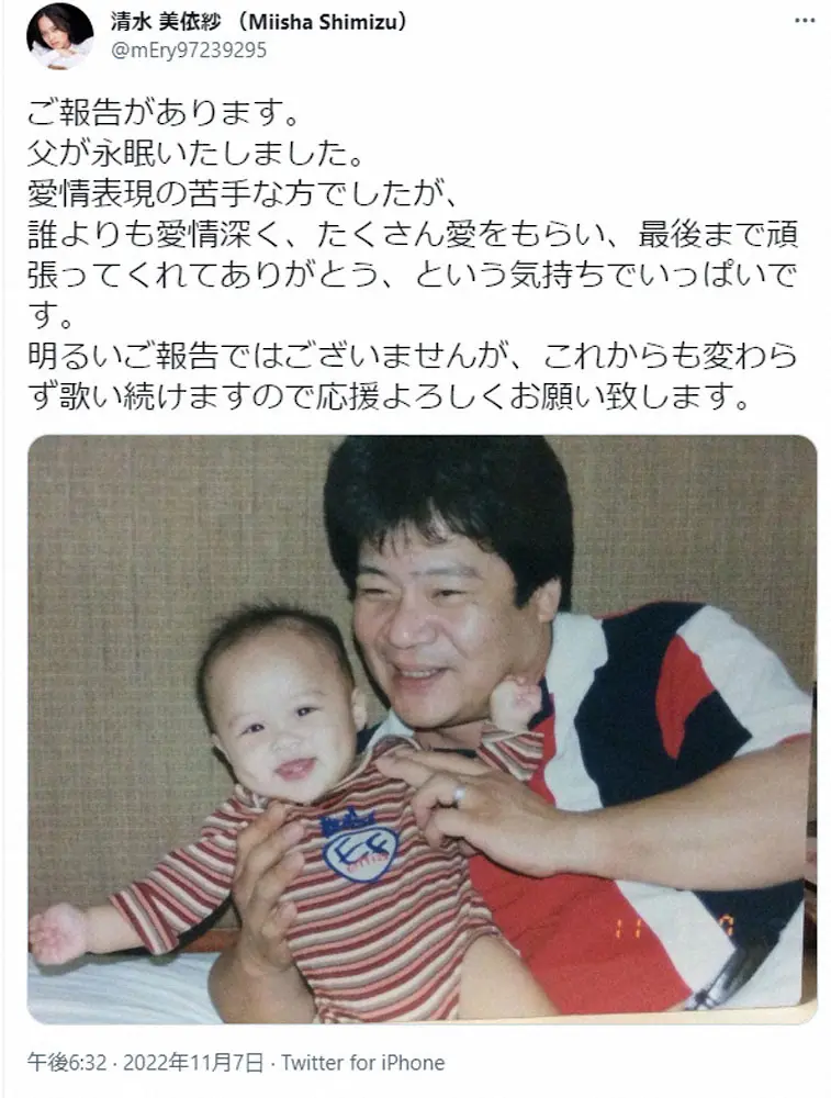 清水美依紗 Photo by スポニチ 歌手の清水美依紗、最愛の父が亡くなったことを報告「最後まで頑張ってく… ギャラリーで見る この記事のフォト 2022年11月07日の画像一覧 もっと見る 2022年11月07日の画像をもっと見る