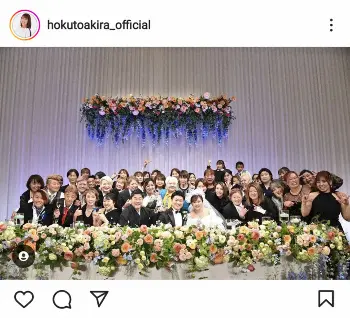 北斗は6日、新郎新婦の笑顔の2ショットとともに「私の可愛い、息子と娘 本日…沢山の皆さまに支えていただき満開の笑顔の花を咲かせてくれました」と長男夫婦の結婚式を報告。「皆様に育てていただいたこの満開の笑顔の花を大切にして行きたいと思います。今後とも息子夫婦を宜しくお願い致します。ご列席いただきました皆様、本日は有難う御座いました」と感謝をつづっていた。
