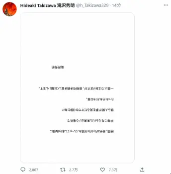 滝沢秀明氏ツイッター(@h_Takizawa329)から 滝沢秀明氏 注目の初ツイートは…逆さま文書「時代、時代がただただ流れて… ギャラリーで見る この記事のフォト 2022年11月08日の画像一覧 もっと見る 2022年11月08日の画像をもっと見る