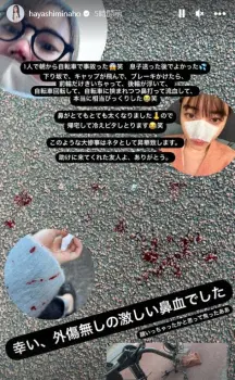 林アナは「下り坂で、キャップが飛んで、ブレーキかけたら、前輪だけきいちゃって、後輪が浮いて、自転車回転して、自転車に挟まれつつ鼻打って流血して、本当に相当びっくりした」と事故時の状況を説明。「鼻がとても太くなりましたので帰宅して冷えピタしとります」と腫れあがった鼻の写真を公開し「助けに来てくれた友人よ、ありがとう。幸い、外傷なしの激しい鼻血でした」と報告した。