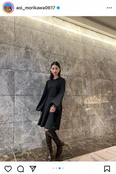 森川は「ミニ丈にロングブーツが気分」と黒色のミニスカワンピに膝まであるロングブーツを履いた気品あふれるショットを投稿した。
