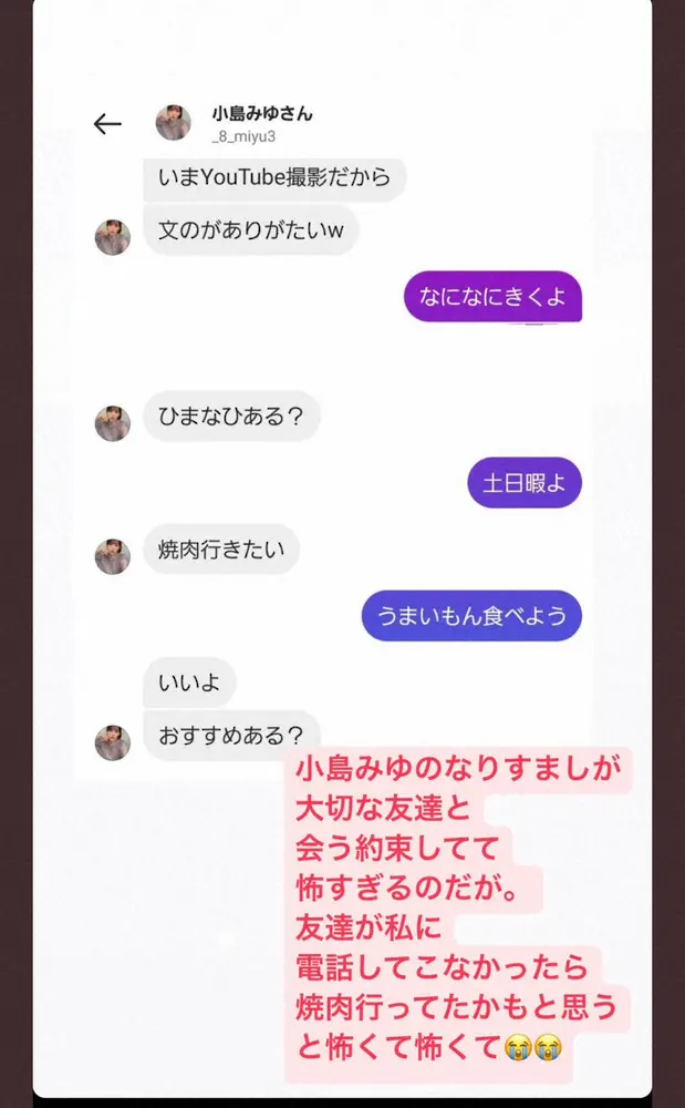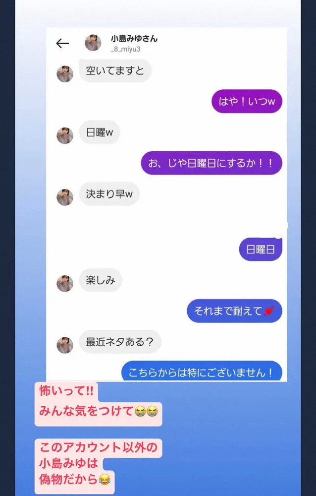 小島みゆツイッター(@pina_8_)から 小島みゆ なりすましアカが友人と食事の約束「怖すぎるので助けてくださ… ギャラリーで見る この記事のフォト 2022年11月10日の画像一覧 もっと見る 2022年11月10日の画像をもっと見る