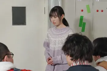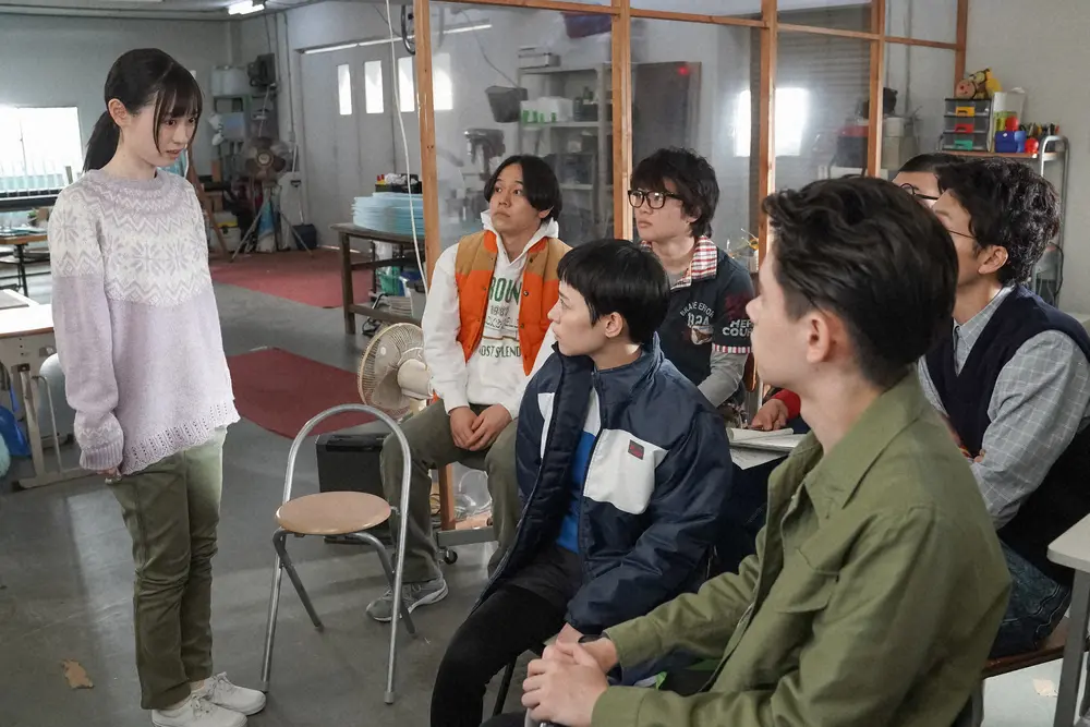 連続テレビ小説「舞いあがれ!」第30話。部室兼工房にて。藤谷翼(山形匠)、由良冬子(吉谷彩子)、日下部祐樹(森田大鼓)、佐伯功(トラウデン都仁)にあることを言う岩倉舞(福原遥・左)(C)NHK
