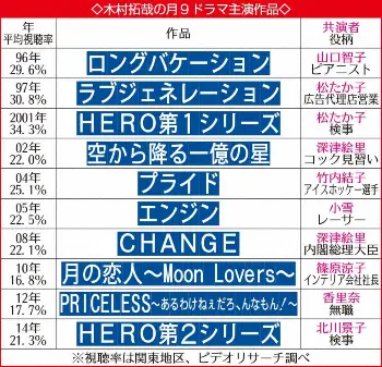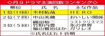 木村が月9で主演するのは14年の「HERO」以来、11度目で自己の歴代最多を更新。脚本は「踊る大捜査線」シリーズで知られる君塚良一氏、演出は「プライド」(04年)などでタッグを組んだ中江功氏という盤石の布陣だ。