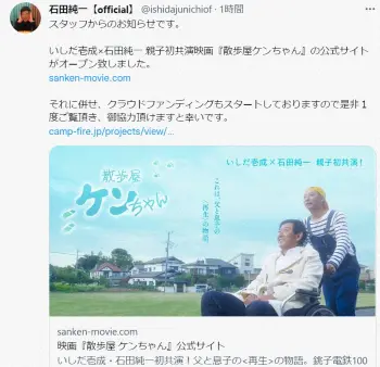 俳優・いしだ壱成(47)と父で俳優の石田純一(68)が親子初共演する来年4月公開予定の映画「散歩屋ケンちゃん」(監督寺井広樹)の公式ホームページが完成したと、ツイッターで発表された。