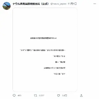 投稿したのは「ナウル共和国政府観光局(公式)」。南太平洋に位置するナウル共和国政府観光局日本事務所の公式アカウントで「世界最小の共和国」「総人口1.1万人(ナウル国民は約1万人)」「面積が品川区くらいの南太平洋の島」などと紹介している。