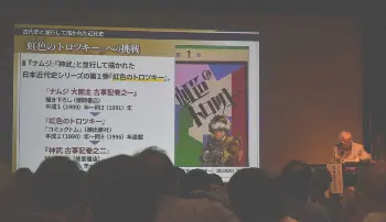 「宇宙戦艦ヤマト」や「機動戦士ガンダム」などで成功を収めたアニメを離れ、1989年から「ナムジ」などで古代史をテーマに漫画を描き始めた安彦氏。時を同じくして、90~96年には戦前の旧満州(現中国東北部)を舞台に「虹色のトロツキー」を描いた。講座の聞き手を務めた“漫画出版の生き字引き”編集者の綿引勝美氏(メモリーバンク)に促され、その思いを語った。