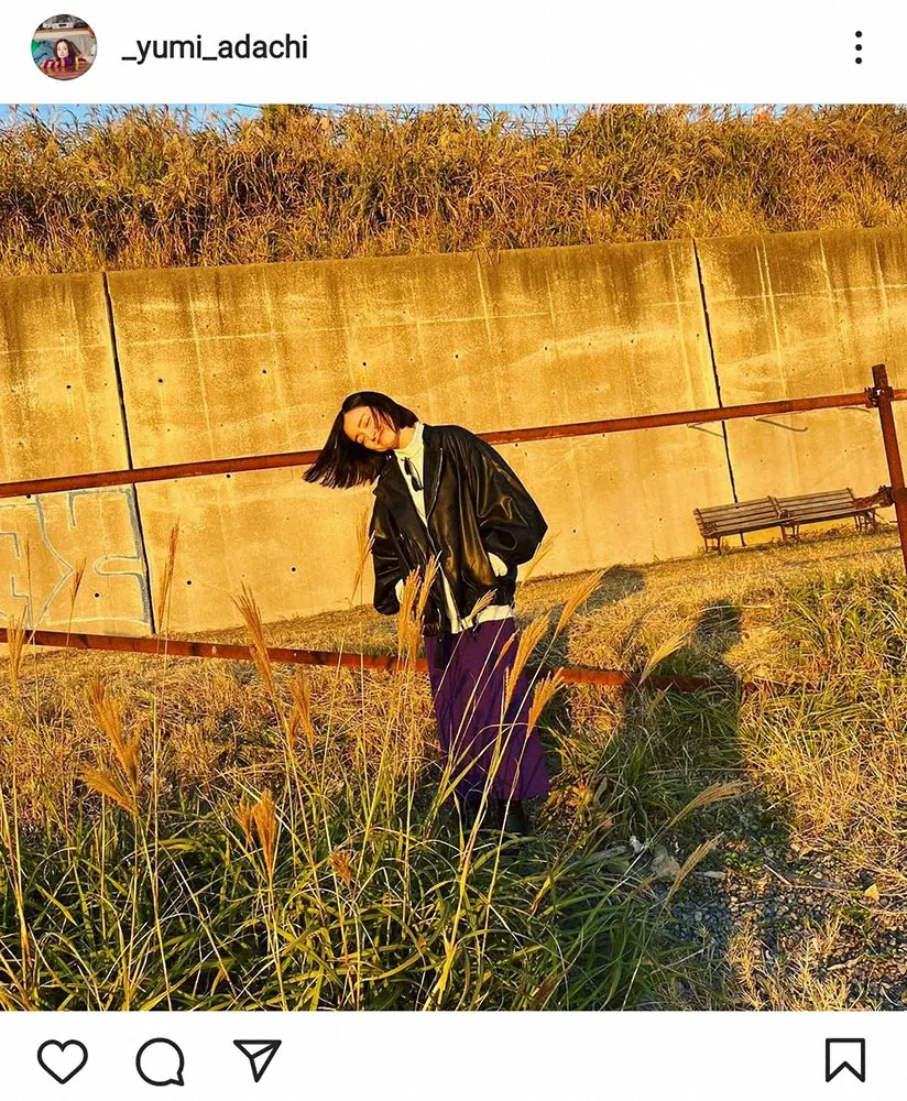 安達は「結婚記念日、9回目」と記し、黒いアウターに紫色のボトムスを合わせ、秋の夕暮れの中で微笑みを浮かべてたたずむショットを投稿。背後には2つの影が写っており、桑島氏が撮影した写真と思われる。