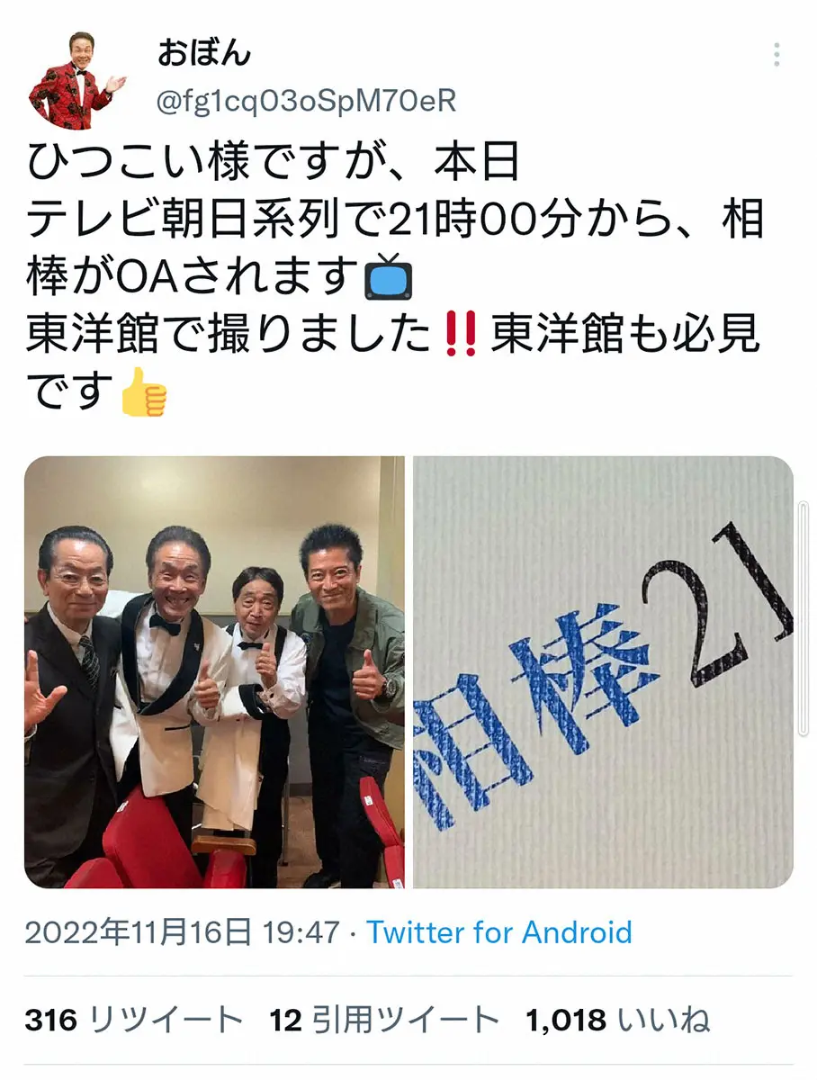 「おぼん・こぼん」のおぼん(右)とこぼん Photo by スポニチ 「おぼん・こぼん」 ドラマ「相棒」出演が話題「演技が自然で良い感じ」… ギャラリーで見る この記事のフォト 2022年11月16日の画像一覧 もっと見る 2022年11月16日の画像をもっと見る