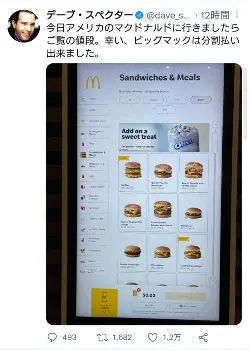 スペクター氏はマクドナルドのメニューの写真を投稿し「今日アメリカのマクドナルドに行きましたらご覧の値段」とつづった。写真によるとビッグマックは6.37ドルで、円安の影響で1ドル140円計算だと892円に。ちなみに日本だとビッグマックは410円とあり、倍以上の値段となり、「幸い、ビッグマックは分割払い出来ました」といつもながらのジョークも。