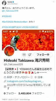 この日、誕生日を迎えたYOSHIKIにはさまざまな人から祝福の声が寄せられている。そんな中、アカウント開設以降、何度もプロフィル欄を更新している滝沢氏。11日にYOSHIKIが「ラルク アン シエル」のHYDE、「LUNA SEA」や「X JAPAN」などで活動するギタリストのSUGIZO、ギタリストのMIYAVIともに新バンド「THE LAST ROCKSTARS」の結成を発表した際も、プロフィル欄で「奇跡のバンド結成!わーぃわい」とバンド結成に歓喜していた。