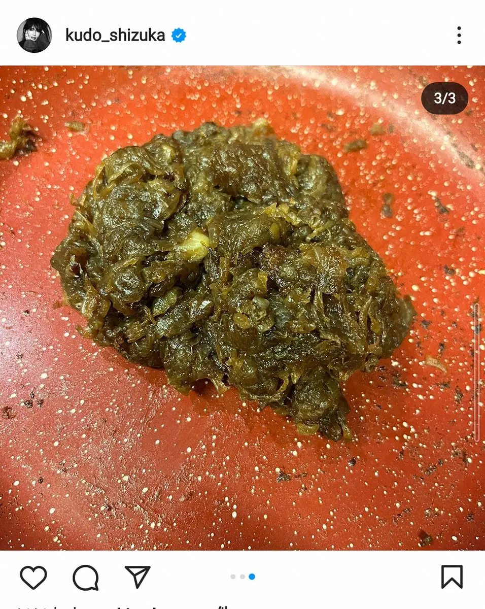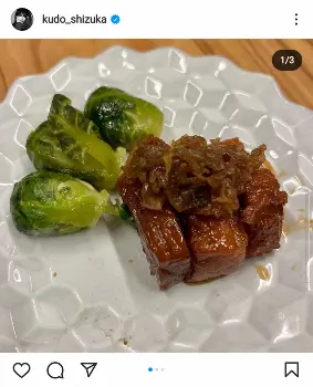工藤は「時間があるうちに玉ねぎをこれでもか!くらい塩を少し入れて炒めます。とにかく炒めたら何にでも合うので便利です!そして甘い 最初にお酒とお水で豚ブロックを煮た煮汁を少し取り、芽キャベツをに煮ています。水とお酒で煮た後に、醤油、砂糖類、生姜、スターアニス一欠片。量はお好きな味に!」とつづり、フライパンで玉ねぎを炒める動画や、出来上がりを豚ブロックの角煮に乗せた写真などを披露した。