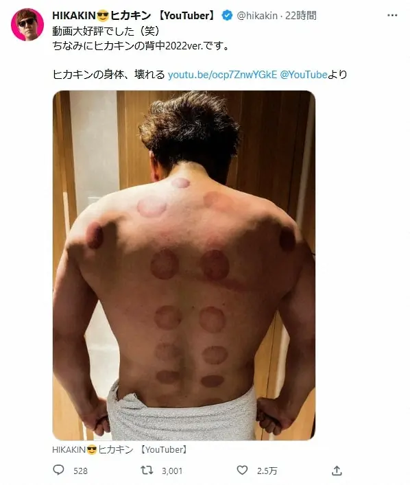 ユーチューバーのHIKAKIN(ヒカキン) Photo by スポニチ これが「ヒカキンの背中2022ver」“荒々しい”姿にファン驚がく「跡が痛そう… ギャラリーで見る この記事のフォト 2022年11月21日の画像一覧 もっと見る 2022年11月21日の画像をもっと見る