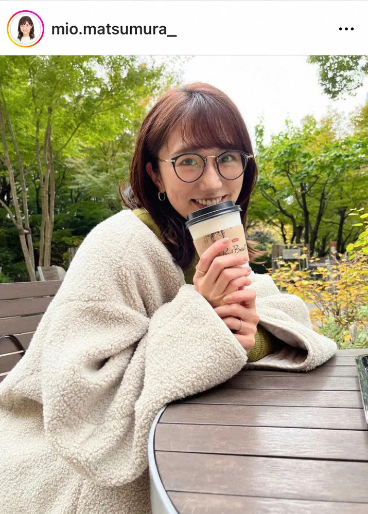 「サクッと朝のお出かけ」と公園のような場所でコーヒーのようなものを口にするメガネ姿のプライベートショットを公開。「パパがいるときはママよりパパな娘 一枚目はそんな娘が撮ってくれました」と愛娘の撮影であることを明かした。