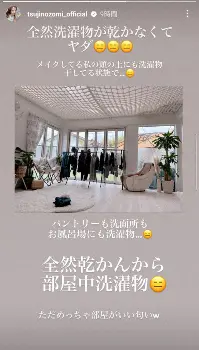 さらにインスタグラムのストーリーズでも「メイクしている私の頭の上にも洗濯物干している状態で…」とつづった。しかし「めっちゃ部屋がいい匂い」と思わぬ効果を明かした。