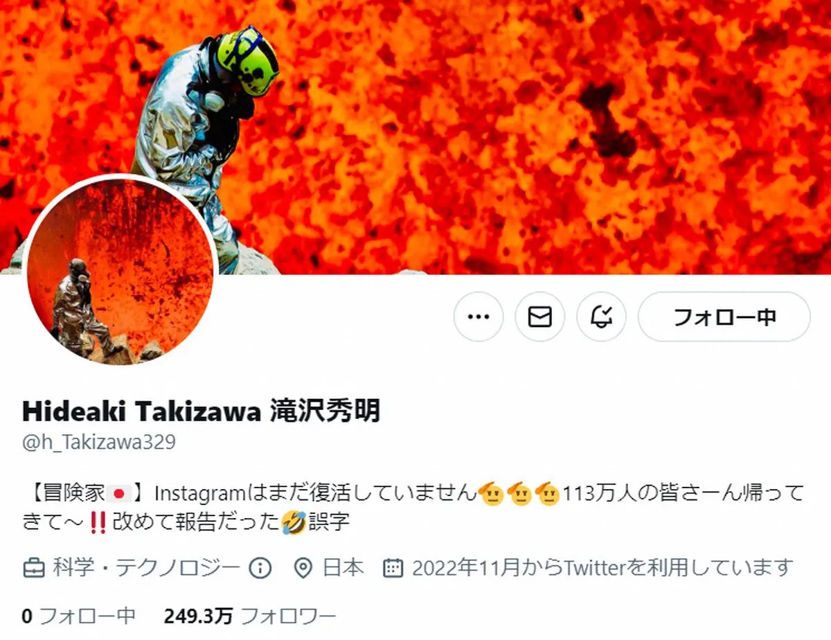 滝沢氏は「俺のInstagramどこに行った~~?もしもーーーーし」と、冗談交じりにツイート。プロフィル欄では「Instagramはまだ復活していません 113万人の皆さーん帰ってきて~ 改めて報告だった 誤字」とつづった。