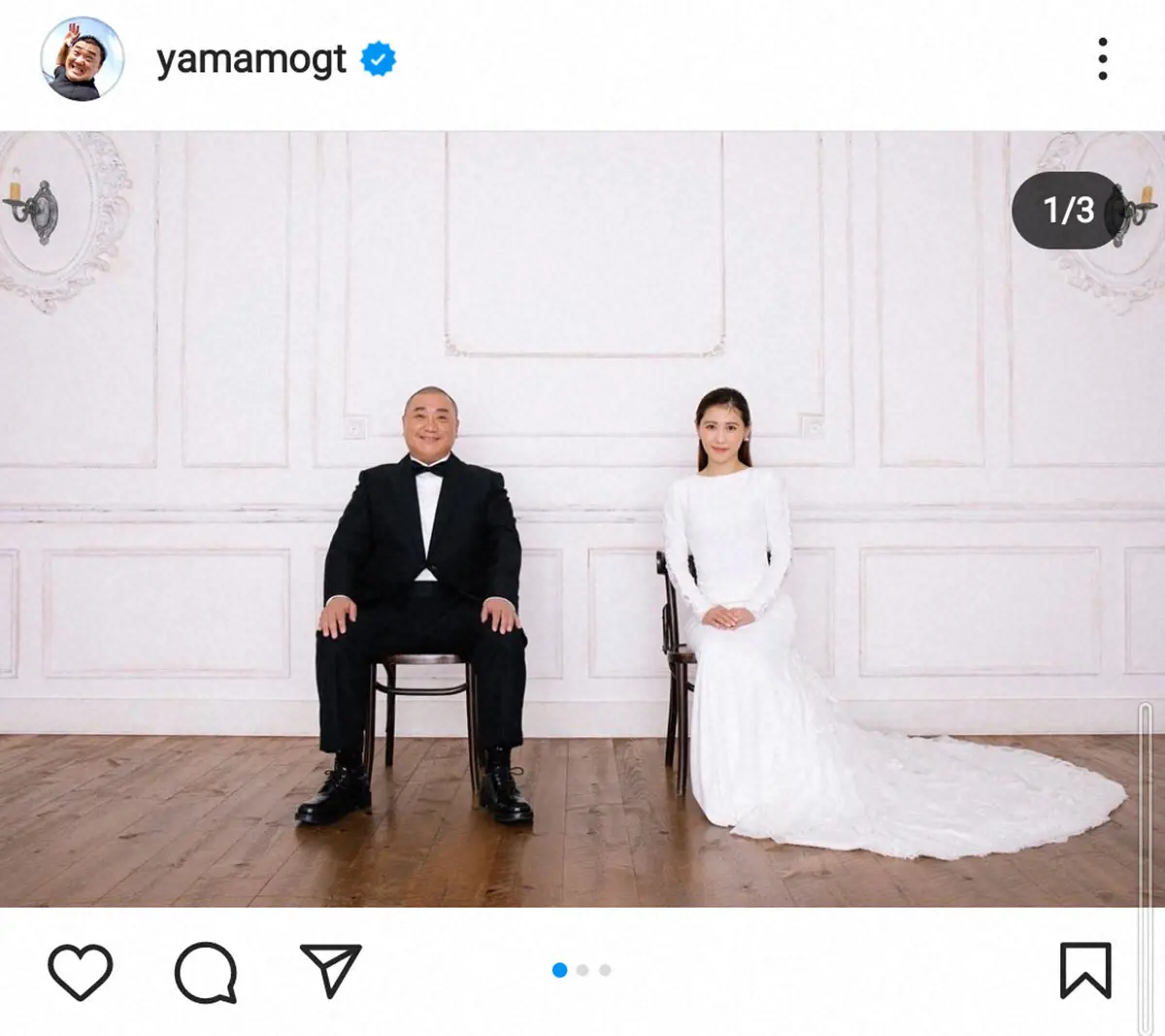 山本は自身のインスタグラムでも喜びを報告。ウエディングドレス姿の西野とタキシード姿で並び笑顔の2ショット写真や、結婚指輪をした西野と山本のコミカルな姿などを投稿し「ご報告です。私、山本圭壱は11月22日良い夫婦の日に西野未姫さんと結婚しました」と報告。