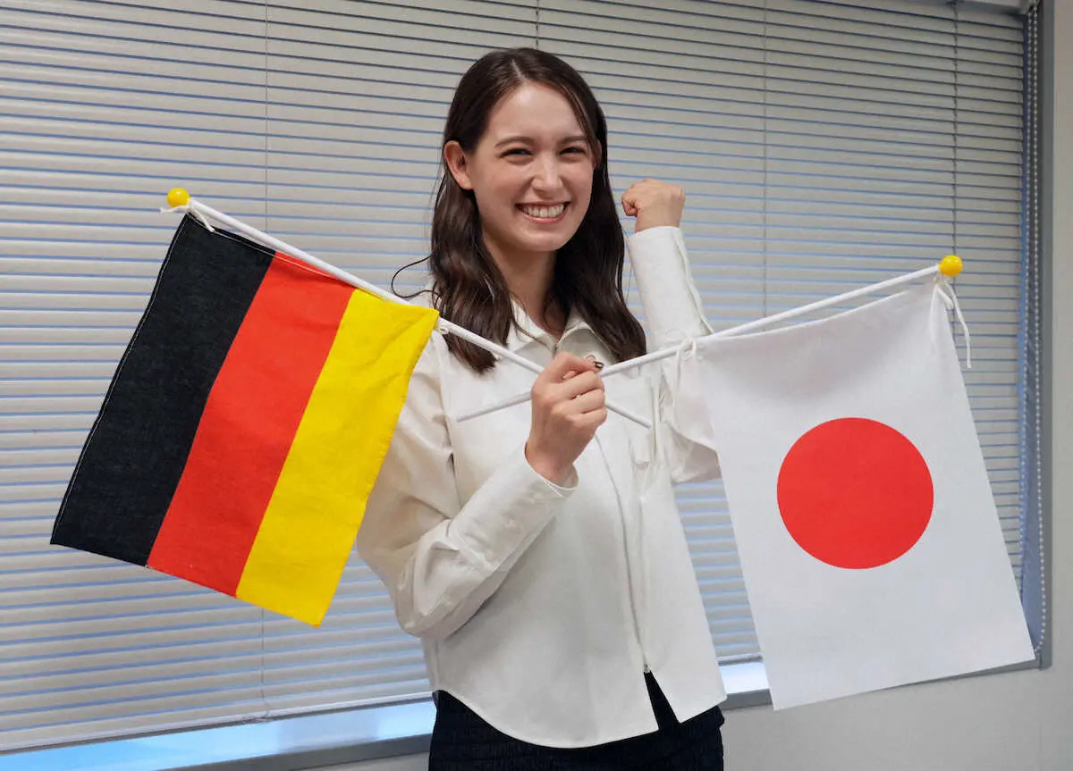 日本とドイツの国旗を手にポーズをとるトラウデン直美(撮影・郡司 修)