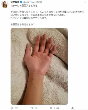 足立は「たまーにお風呂入るとなる」とつづり、赤くむくんだ腕から手にかけての写真をアップ。「手のひらが痒(かゆ)くなってきて、ちょっと腫れてるのか浮腫んでるのかわからない感じになって、そのまま肘辺りまで痒くなるあれ。ひどいときは蕁麻疹(じんましん)もでちゃうやつ」と症状を伝え「お風呂あるあるだよね?」とツイートした。
