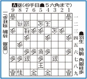 中盤戦では羽生が放った49手目▲5六角(A図)の自陣角が絶品の一手。序盤の▲6六歩も自陣角の配置によって生き生きと輝いている。攻めては後手陣の急所の金を狙う▲3四歩、受けては△2九飛を防ぎつつ遠く8九桂にもひもを付けている。攻防の名角によって羽生がリードを確かなものにした。