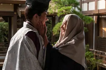 政子は「くう~」と義時の首に手をやった。縁側の2人は笑顔。束の間、姉弟の時間が戻った。