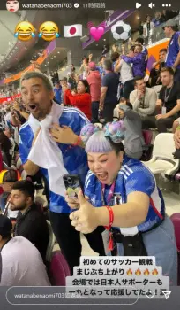 その後、カタール入りし、日本代表のユニホームを着て、知人のヘアスタイリストらとともにスタジアムで応援。「やばいやばいやばいにょ!喉潰れたw」と大興奮の様子で、日本のゴールが決まって沸くスタンドや歴史的勝利の瞬間を動画でアップした。「日本勝ったー!!!周りのドイツサポーターガン無視で盛り上がるうちらw」「初めてのサッカー観戦 まじぶち上がり 会場では日本人サポーターも一丸となって応援してたよ!涙」とつづった。