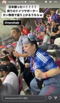 お笑いタレントの渡辺直美(35)が24日までに自身のインスタグラムのストーリーズを更新。23日にサッカーW杯カタール大会1次リーグE組の初戦で日本が強豪ドイツを撃破し、大興奮で現地観戦した様子をハイテンションで紹介した。