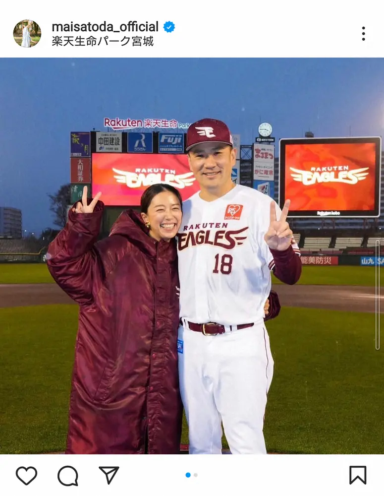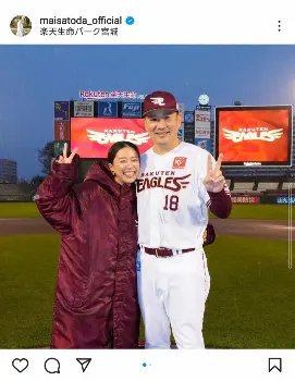 タレントの里田まい(38)が24日までに自身のインスタグラムを更新。夫の楽天・田中将大投手(34)との球場での笑顔の2ショットを披露した。