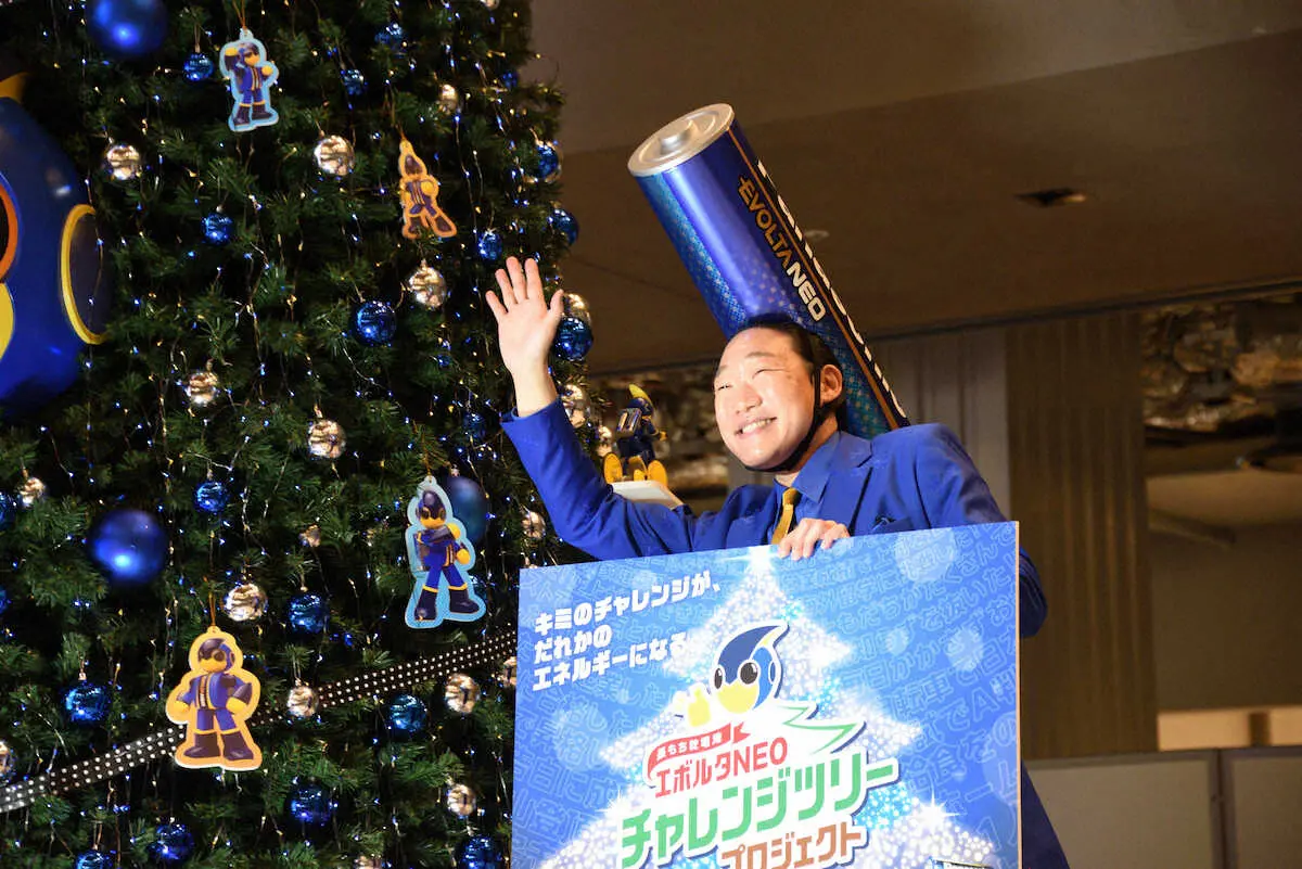 この日はトレードマークのリーゼントを封印し、巨大な「エボルタNEO」を頭に装着して登場。「頭に乾電池を着けてると、エネルギーが沸いてくる感じがしますね」と笑う。前日にサッカーFIFAワールドカップ(W杯)カタール大会の1次リーグ初戦で日本がドイツに歴史的勝利したことを受け「本当に凄い!これからは日本の時代になるかもね」と興奮気味に祝福した。