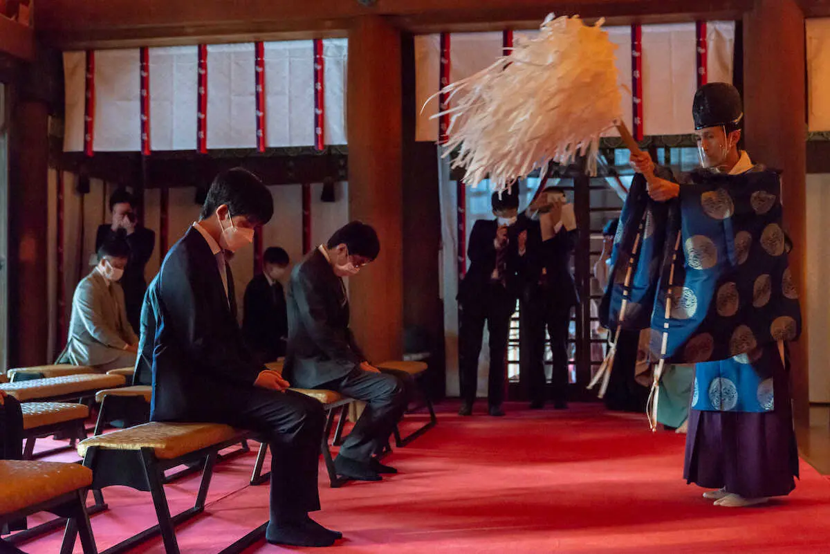 「光の道」で知られる宮地嶽神社でお祓いを受ける藤井聡太竜王と広瀬章人八段(日本将棋連盟提供)