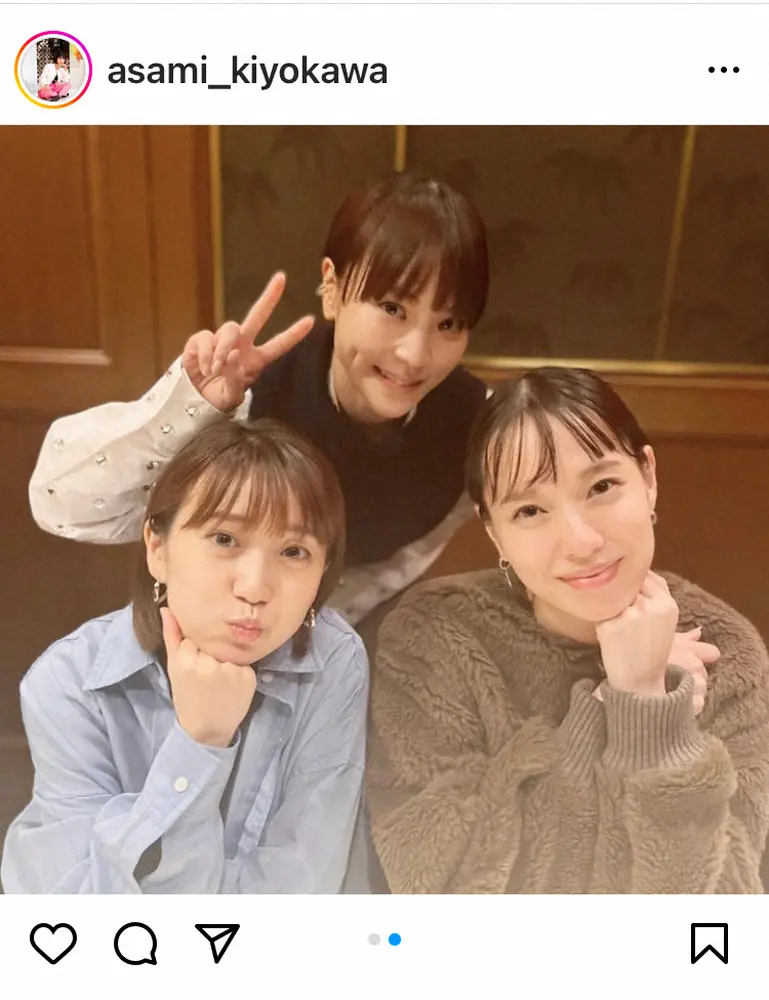 清川氏は3人でのショットをこれまでも公開しており、ファンにも仲良しとして知られている。「恵梨香ちゃんのエッセイも楽しみ」「今日も笑った笑った~」とつづり、「#大島優子」「#戸田恵梨香」「#japan」「#actress」「#映画公開中」「#仕事もプライベートも大事」「#清川あさみ」と添えた。