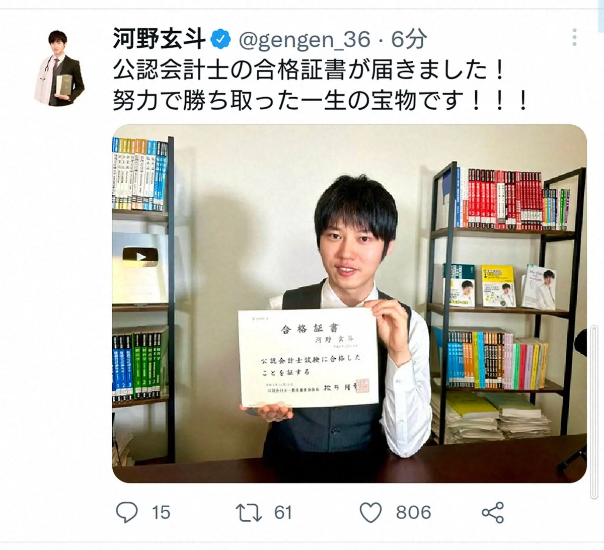 河野玄斗インスタグラム(@gengen_36)から 東大卒の河野玄斗 公認会計士の合格証書が届いたと報告 医師&司法に続… ギャラリーで見る この記事のフォト 2022年11月26日の画像一覧 もっと見る 2022年11月26日の画像をもっと見る
