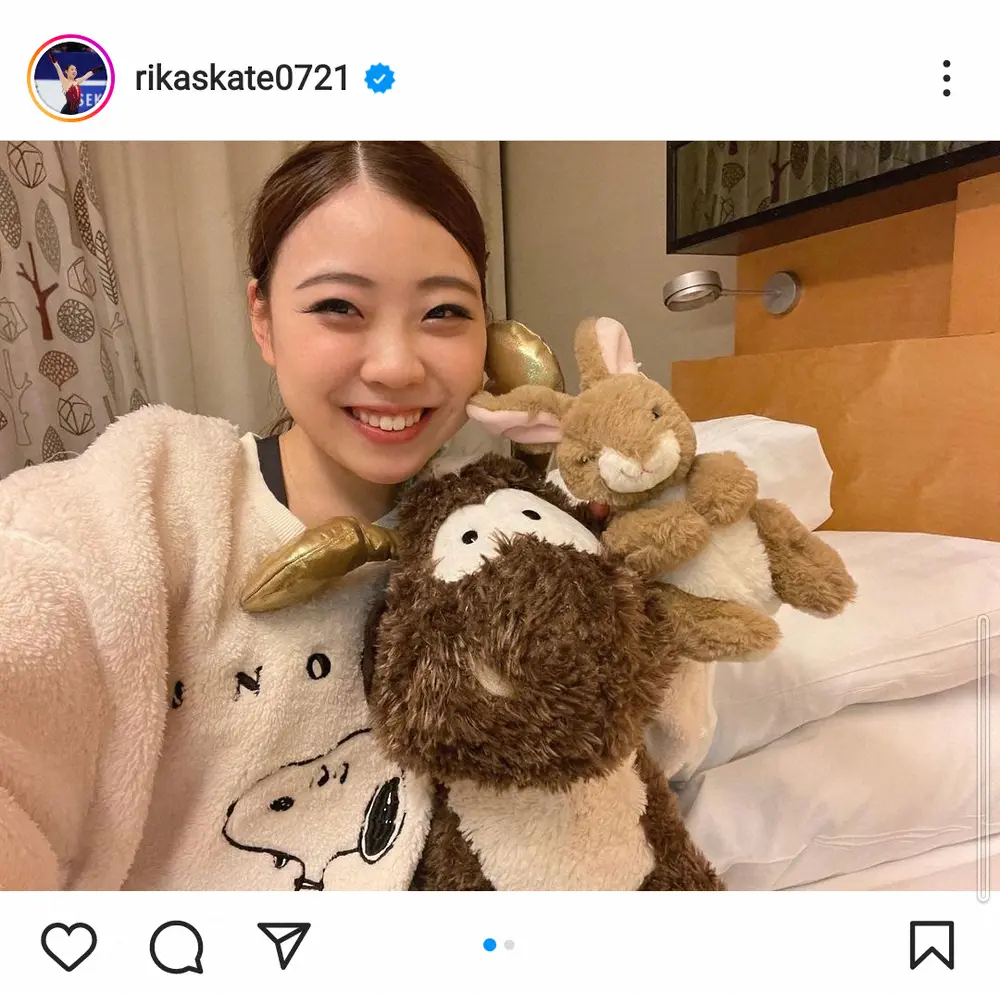 紀平は25日のSPで今季の自己ベストとなる64・07点をマーク、26日に行われた女子フリーでも今季の自己ベストとなる128・36点をマークし、合計192・43点の4位に入った。「頂いたぬいぐるみたちと一緒に部屋に帰ってきました」と記すと、スヌーピーのトレーナーにうさぎなどのぬいぐるみを抱いたショットをアップ。「今日のフリーは頑張りました!皆様たくさんの応援、メッセージありがとうございました」とつづった。