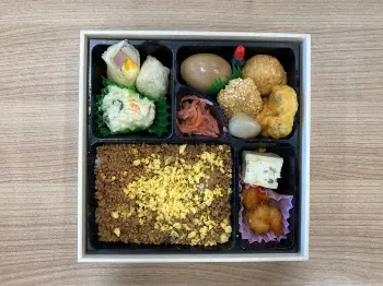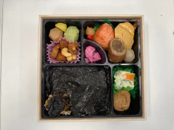 さて、話は変わり、みなさんはテレビ番組の収録の際のお弁当がどんなものか気になりませんか? この日の収録は「津多屋」のお弁当!芸能人が選ぶ楽屋弁当ランキングで、上位に入る大人気弁当です。では、中身はどんなんかなぁ? まずは、私が選んだそぼろから。おかずが充実!お漬物も入れて11種類。しかも、すべて味が似通っていないので、そぼろ、クリームコロッケ、そぼろ、こんにゃく、そぼろ、エビチリ…とそぼろもたくさんのおかずのお相手大変そう。続いて、のり。スタッフさんが一口食べ始めたところを、「ちょっと待ってー!」と撮らせていただきました。こちらは、おかず12種類。ご飯が足りなくなるパターンですね。とにかく、津多屋のお弁当はテンションがあがります。