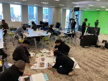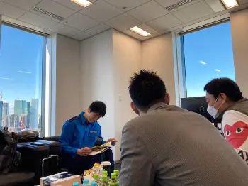 「防犯カメラが捉えた!衝撃コント映像」は、なんと東京支社の会議室で収録しています。実はココだけの話、M-1グランプリの決勝進出者の方が出番前に流れるファイティングポーズあるじゃないですか? あのファイティングポーズを撮影している場所でもあるんです。なので、ある意味、この会議室は、お笑いの聖地なのです。この日、番組ゲストのかまいたち山内さんも大興奮されていました。