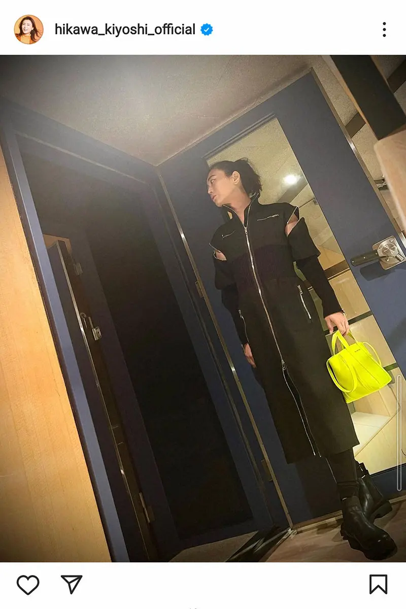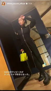氷川は黒い細身のジップワンピースとショートブーツに黄色いバッグ姿の写真を投稿。また、ストーリーズでは「GUCCIのワンピースがドンピシャで好きになった」としている。