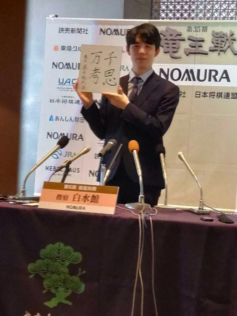藤井聡太竜王(20)=王将、王位、叡王、棋聖含めて5冠=が4日、鹿児島県指宿市「指宿白水館」で初防衛した第35期竜王戦7番勝負の一夜明け会見に臨んだ。会見には現在の心境を記した色紙を持参。「千思万考(せんしばんこう)」とした意図を、「2日制の長い持ち時間の対局で深く考えることができたが、一方で全てを掘り下げて比較することができなかったところもある。これからも持ち時間の長い対局では意識していきたい」と明かした。