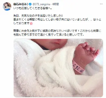 仙石みなみ公式ツイッター(@373_sengoku)から 元アプガ・仙石みなみが第1子女児出産を報告「産まれてくる瞬間に号泣」も… ギャラリーで見る この記事のフォト 2022年12月06日の画像一覧 もっと見る 2022年12月06日の画像をもっと見る